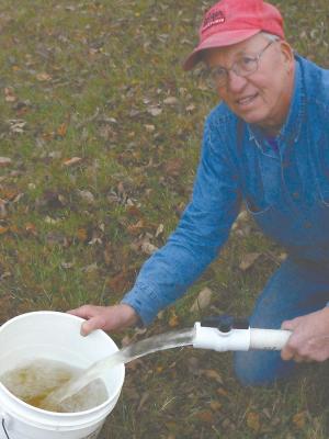 Simple Siphon Empties Ponds Fast FARM HOME Miscellaneous Kenny Ranta found a way to empty out silted-up farm ponds without getting his feet wet He uses a siphon made with electrical conduit pvc pipe and flexible hose Built in 10-ft sections the siphon connects easily for set-up and breaks down easy when done “I don’t buy anything if I can make it ” says Ranta explaining why he doesn’t use a gas-powered pump “I don’t do it to save money but for the fun of making it ” He uses 10-ft lengths of electrical conduit “I just stick male and female ends together and connect as many as I need with duct tape As long as the conduit ends are dry when taped the tape holds the tubes together “I can extend the siphon as far into a pond as needed by just adding more conduit ” explains Ranta To create the siphon effect Ranta fills the pipe with water and then creates a vacuum to pull the water through There’s a shut-off valve at the discharge end with a plug at the pond end The plug consists of a right angle elbow with a small ball stuck in it The ball has an eyebolt in it that’s attached to a cord “As I fill the pipe with water the pond end sinks to the bottom When it’s full I shut the fill valve and open the discharge valve creating a vacuum A tug on the cord pulls the plug and the water starts flowing ” Water flows at a rate of about 20 gal a min until the end of the pipe in the pond is exposed “The great thing is that when I break it all down I can tie the sections of tubing into a bundle and carry them out on my shoulder ” says Ranta Contact: FARM SHOW Followup Kenneth Ranta 1711 Wornall Rd Excelsior Springs Mo 64024 ph 816 536-6320; kiranta1@yahoo com