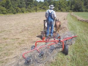 Mower: He modified a one-horse ground drive mower. “I put a steerable axle on the mower tongue, which eliminated side draft,” he says. With a team of 3 minis, he has had the best success using a 32-in. long SCH EasyCut cutterbar.