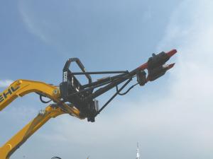 The Tele-Clipper includes Precision’s Extreme Duty cutting head for slicing branches and trees up to 8 in. dia. The powerful 5 by 8-in. cutting cylinder produces almost 25 tons of pushing pressure at 2,500 psi. Blades are made of 3/4-in. tempered steel and mounted on hardened pivot bushings with grease zerks. The clipper has extra long upper and lower cutting plates for easy release of the tree or limb being cut. The self-cleaning side spacers reduce everyday maintenance of the cutting head.