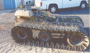 “I built the machine 5 years ago, and it has really changed the way I hunt. Now I want to shoot deer on the marsh just for a chance to use it,” says Bassett. “The rear tires drive the machine without any slippage inside the tracks, and the side pieces keep water from splashing on me as I drive. I use the mower’s original controls to steer and go forward and backward. If I need to haul more than one deer, I pull the second one on a rope behind me.”