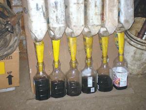 He cuts the bottom off 1-pint plastic fuel additive containers and turns them upside down to serve as funnels. The containers are placed in a row, held in place by a pair of long screws that extend about 4 in. out of a piece of plywood. The necks of the funnels are inserted into empty 64 oz. plastic orange juice bottles. More screws are used to hold a row of upside down oil jugs in place above the funnels.