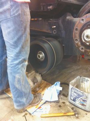 Innovative Way To Flush The Oil In Case IH Quadtrac Tractor TRACTORS Miscellaneous Herb Rempel Rosenort Manitoba: “We needed to flush the oil in our Case IH Quadtrac tractor To do that you need to turn the rollers and idlers We saved a lot of hours on the tractor – and lots of fuel – by bolting an electric motor off a table saw to a piece of plywood and fitting it with a large drive belt I engage the belt-drive by putting a piece of wood under the plywood and stepping on the end to tighten the belt ”