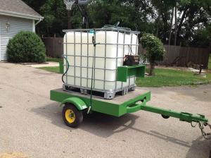 Ron Zehner needed an easier way to water his garden, which is located about 150 ft. from his house, without having to move hoses around all the time. So the Oshkosh, Wis., farmer converted a used 300-gal. liquid tote into a “watering cart” that mounts on a small trailer that he pulls behind his Deere Gator.