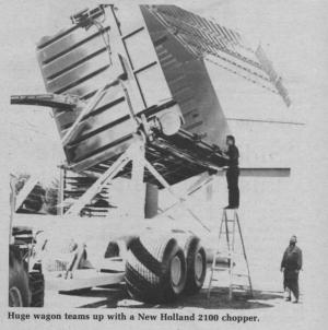 The wagon was built for Gracemar Farms, near Chilliwack, for use behind a New Holland 2100 chopper. Hydraulic capacity on the chopper had to be boosted to handle operation of the wagon.