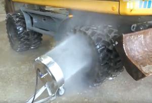 The Hurricane Pro undercarriage cleaner is about the closest thing you’ll ever get to a white tornado, with streams of water up to 4,000 psi blasting out of rotating nozzles on a simple 3-wheeled cart. Once you hook up a pressure washer, you can wheel it under vehicles and equipment with at least 6 1/2 in. of clearance and go to work.