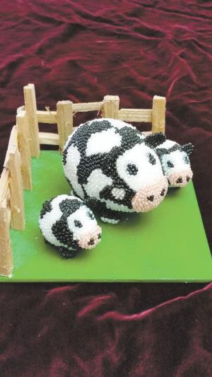 Her cardinals and other birds, flowers and geometric designs are popular with customers at the craft shows she attends. So are the animal families (a cow, pig or sheep with babies) that she makes entirely with beads.