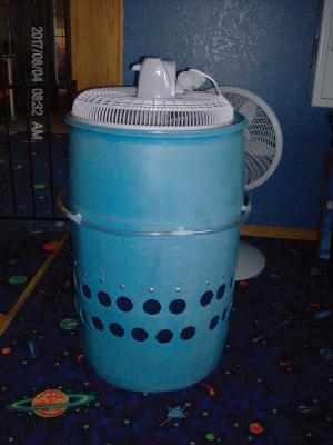 He started with a 55-gal. plastic barrel and used a hole saw to cut the lid out. A 120-volt water pump sets on the bottom of the barrel and a 20-in. dia. fan lays face down on top of the barrel. The bottom 1/4 of the barrel is filled with water.