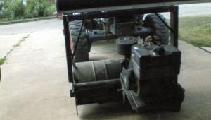 Bucket-Mounted Rototiller Powered By Gas Engine ENGINES Don Ritchhart Lincoln Ill 91 years old recently sent FARM SHOW photos of a loader-mounted rototiller he put together that’s powered by a pull-start gas engine Ritchhart raises or lowers the loader to control the rototiller’s depth He built a rectangular frame that bolts onto the bottom of his Bobcat tractor’s loader bucket and bolted a 3-ft wide rototiller off an old pull-type garden tiller to the bottom of the frame The rototiller is belt-driven by a 10 hp gas engine The entire unit rides on a single wheel off a riding mower that functions as a gauge wheel “It’s easy to use and I have a good view of everything in front of me I just tilt the bucket to adjust the depth of the rototiller’s tines ” says Ritchhart “The rototiller was equipped with a small pulley which just happened to match up with the engine ” Ritchhart built the unit last summer and used it to prepare the ground where a big above-ground swimming pool had stood “The owner wanted to reseed the ground with grass but there was a lot of sand on top with some sod growing on it and dirt below the sand I wanted to mix the sand and dirt together ” He spent only about $500 to build the unit “My friend and neighbor bought the rototiller and wood chipper at an auction and gave them to me I paid someone to weld the frame together which was my biggest cost ” Ritchhart used existing holes in the bucket to bolt the frame on and didn’t make any modifications to the bucket at all “I can remove the entire rototiller by pulling three bolts ” he notes Contact: FARM SHOW Followup Don Ritchhart 1631 N Kankakee St Lincoln Ill 62656 ph 217 732-6071