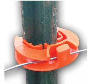 The patented insulator consists of a horseshoe-shaped hard plastic “jaw” that snaps into place on T-posts and can be used on poly rope, dual strand barbed wire, and 12 to 14-ga. high tensile wire. No tools are required to install or remove it.