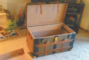 After the trunk dries, he restores the necessary wood parts and removes rust with a rust removal product. He replaces the old paper with cotton cloth glued onto paper before gluing it to the inside of the trunk. If salvageable, he oils the leather strapping and handles several times to soften them up. If they are rotted, he purchases new 1/4-in. thick leather from a local Amish man. His daughter orders hinges, locks and other parts from an online store.