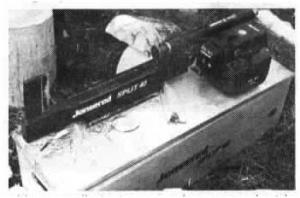 Our new portable Jonsered wood splitter weighs just 65 lbs. and can be powered by either a pull-start gas engine or an electric motor. The splitter has a 16-in. stroke and develops 3 tons of pressure, enough to split even the hardest hardwoods. It's small enough that you can use it on your pickup tailgate. Splits logs up to 12 in. in diameter. Sells for $1,379 (Canadian). (Josa Corporation Ltd., 200 Hamford St., Lachute, Quebec J8H 4L2 ph 514 562-8872)