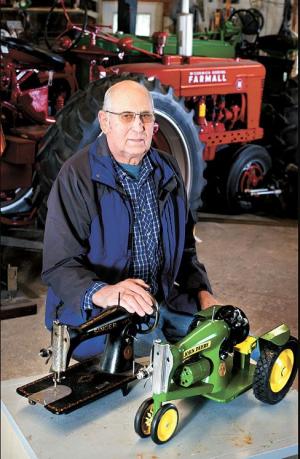 It takes Gene Blatchford about 15 to 20 hrs. to transform an old sewing machine into a small-scale version of a farm tractor. The retired Nebraskan says his creations are like mini pedal tractors, painted in colors to match latter-day Farmall, International, Deere, Ford, Massey and Oliver brands.