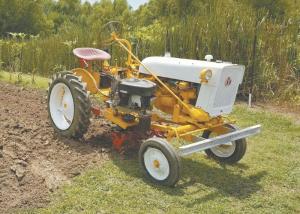 Walk Behind Rototiller Belly Mounted On Farmall Cub Tractor FARM HOME Miscellaneous I reworked an old 1960’s Sears walk-behind rototiller so I could belly-mount it on my 1972 Farmall Cub tractor It mounts on a separate home-built steel frame that pins onto the tractor The frame bolts to a specially designed 2-wheeled dolly for quick installation and easy storage The 36-in wide rototiller is belt-driven by the 17 hp gas engine off an old riding mower I stripped the rototiller down to the engine gearbox and tines The frame they attach to is equipped with a pair of steel arms that extend up to the front axle and are free to pivot up or down on hinged brackets A short length of chain connects the back of the frame to a lift arm on the tractor To attach the rototiller to the tractor I park it next to the tractor and connect up the front and rear I can start and stop the engine and also adjust its speed right from the tractor Homemade battery cables lead from the rototiller engine to the tractor’s battery under the seat The engine’s fuel line hooks up to the tractor’s gas tank and the throttle cable is independent of the tractor’s throttle It runs smooth and strong Everything on it is simple but it took a lot of trial and error to get it to work just right My son and grandson helped me build it I came up with the idea because I wanted to switch to make 36-in bedded rows in my garden The rototiller tines exactly match the space between the tractor’s rear tires The tiller breaks up the soil and then I pull a set of discs behind on a home-built toolbar that forms the beds Jesse LeBlanc 248 Old Spanish Trail Gibson La 70356; ph 225 287-0679; jesseleblanc33@yahoo com