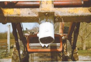 “I wanted an easier way to pound metal fence posts into the ground, so I welded a short length of 2-in. dia. galvanized pipe to the bottom frame that supports my loader-mounted bale spear. My loader tractor has hydraulic downpressure, so I just place the top of the post inside the pipe and use the loader to push it down into the ground.