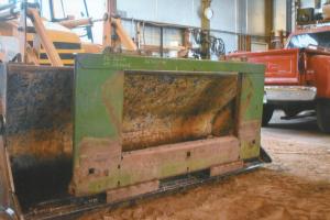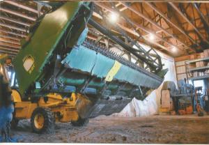 To make replacing skids even easier, Mills came up with a quick, easy way to lift the head off its transport cart and tilt it to an almost vertical position. He modified the front part of the feederhouse off a junked Deere 6620 combine so it can be quickly and easily installed in the front loader bucket on his backhoe.