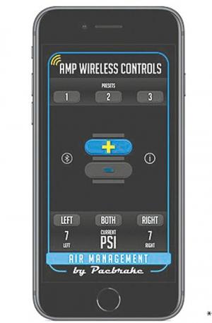 The AMP Wireless Controls fit on the frame rail of any vehicle, works with any air spring on the market, and any existing onboard air system. The kit includes a controller, solenoid block, sensors and harnesses, a phone app for Android devices, air lines, pressure connectors and mounting hardware. Installation takes about an hour. The kit is sold by several online retailers for about $550.