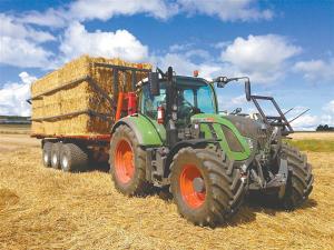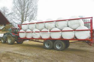 No straps are needed when hauling big bales with the MetaX bale trailers from Swedish firm Metsjö AB. Hydraulically activated arms mounted at deck level rise up to press into bales with up to 6 1/2 tons of pressure. The trailers come in 30 and 40-ft. lengths and have transit speed of just over 30 mph.