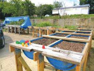 He screws the half barrels onto 3-ft. tall wooden frames made from 2 by 6 boards. There are 8 half-barrels lined up in 2 side by side rows. Mariner attached 2 by 6 boards across the tops of both frames, and also above the barrels where they’re joined together, to keep everything stable. He also drilled drain holes in the bottom of each barrel.