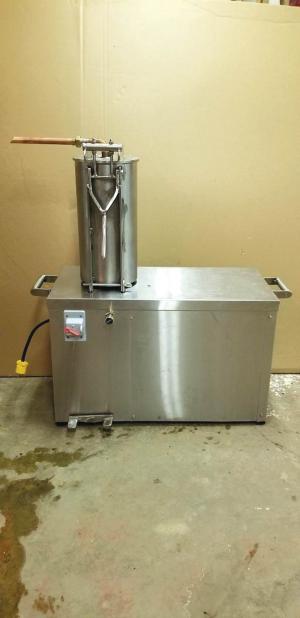The heart of the stainless steel stuffer is a small $450 hydraulic unit he purchased at an auto parts store. Encased in a stainless steel base, a piston pushes up against a plate at the bottom of the cylinder that holds the meat, forcing the meat out through a 3/4-in. copper pipe and casing.
