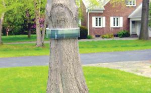 The climbing bug band consists of 2 materials. The first is a double layer of 3-in. wide white fiber that is wrapped around the tree. In the case of deeply furrowed bark, a narrow putty knife should be used to push the fiber into the furrows so it clings to the bark.