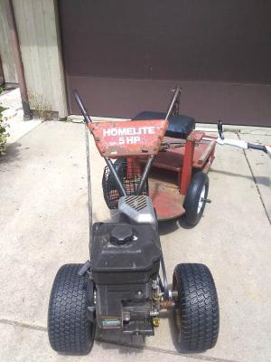 When Paul bought a new tiller, he figured the old tiller would make a handy cart. He removed the tines, replaced them with wheels, and attached the power unit with a bolt to a cart that he made with an axle, angle iron, and plywood.