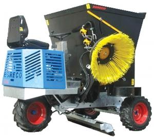 Do-It-All Machine Loads Spreads Scoops And Sweeps DAIRY EQUIPMENT & IDEAS “The Bedding Spreader was built to spread loose material like wood shavings and straw ” says Reinald Treur Dalefield Ag The company is the North American distributor for the Dutch-made machine It can be fitted with an optional rotating broom and a scraper bar for cleaning slatted floors Powered by a 3-cyl 20 hp Kubota engine the hydrostatic drive provides infinite speeds in forward and reverse up to 8 mph A dedicated hydraulic pump powers forward and reverse movement A second hydraulic pump powers other components including an agitator in the self-loading 46-cu ft hopper Simply tilt the hopper forward drive into the pile tilt the hopper back and begin spreading The spreading disk produces much less dust than competitive units with blowers and can deliver even damp materials to the bedded area With a total length of only 84 in the 3-wheel design allows a turning radius within a standard 8-ft aisle The rotating brush with its 3-way valve can operate at the same time as the spreading system or separately It’s fully adjustable to match the height of the stalls and moves up out of the way if driving over a manure pile The hydraulic manure scraper mounted under the hopper moves material through slatted floors as brushing and spreading are underway The scraper blade is 68 in wide “The Bedding Spreader has the weight of an average dairy cow ” says Treur “It’s very safe on slatted floors ” The Boreco Bedding Spreader with the commonly included rotating brush is priced at $34 000 Canadian Contact: FARM SHOW Followup Dalefield Ag 366007 Evergreen St Burgessville Ont Canada N0J 1C0 ph 519 863-5156; toll free 855 845-9755; info@dalefieldag com