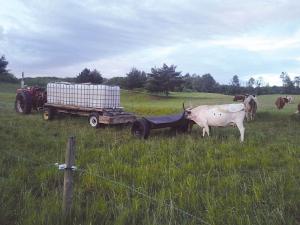“At first we tried attaching a small box to the tank on front of our water wagon, but it was small and could hold only 4 blocks. The cows eventually ripped the box off, so we made something that has more capacity and is more versatile. If we want, we can even hook it up to our 4-wheeler.”