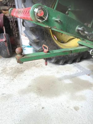 The hitch for the Deere tractor consists of a 2-ft. length of 1 by 2-in. square tubing with a ball bolted onto one end. A hole in the middle of the tubing is used to drop in the draw pin.