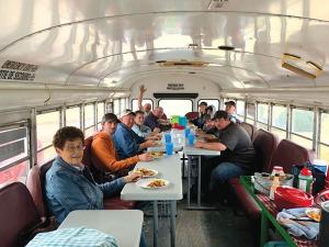 “Supper Bus” Makes Field Meals Fun AG WORLD Kyle Metzger grew up driving hay and silage trucks so she had no problem driving her family’s “Supper Schoolbus” to fields and yards during last fall’s harvest The converted 2005 72-passenger bus was a big dining upgrade for the crew and a lot more convenient for Metzger who prepares the meals with her mother-in-law Joan “We used to haul tables and chairs in the back of the pickup ” Metzger explains “It was a lot of work setting them up and taking them down each time ” Altogether she serves meals about three months a year during planting and harvesting seasons for the Metzger families’ 11 000 acres of canola pulse and cereal crops Spring and fall can be cold hot windy or buggy which can create unpleasant outdoor dining conditions in their Carbon Alberta fields After seeing a bus used on another farm the Metzgers learned that decommissioned buses were affordable They spent $1 600 for the bus and about $2 200 to customize it One expense was an inverter that Metzger’s husband Marty installed on the bus It provides power for the refrigerator/freezer coffee pot lights and cell phone chargers when the bus is parked in a field The rest of the time the bus is plugged in at the farm Another expense was a custom-made John Deere green metal 8-ft serving table with a lip to hold everything in place while on the road The Metzgers removed all the bus bench seats then placed some of them along the bus walls and bolted them down Metzger purchased 18-in wide conference tables online to go with each bench They are not bolted down so they can be moved as needed Usually there are 10 to 12 people to feed during harvest and 6 to 8 people during planting time Condiments water and frozen treats are kept in the refrigerator behind the driver’s seat and the metal table makes it easy for everyone to serve themselves A wash station is set up outside and there’s a handy magnetic paper towel holder on the ceiling Metzger packs totes with disposable dinnerware for surprise guests as well as cleaning supplies and other items “Over the years we have perfected the art of our ‘meals on wheels’ - learning what bags boxes crates thermoses and coolers work best ” Metzger says Workers pack lunches for noon so a good supper is important to keep them going into the night Her menus include lots of meat a starch salad vegetables and something sweet for dessert Casseroles and fresh vegetables are popular To make it even better in 2021 she hopes to add a water cooler that uses big water bottles instead of having to haul heavy pitchers of water from the house The bus makes everything easier for her and the crew which includes three generations of the farm family and hired workers “It’s just been so handy and such a fun change It’s more relaxed and comfortable so everyone is sticking around more sharing stories and making plans for the rest of the day ” Metzger says She adds that hopefully in the future the bus will come in handy for fun family adventures Contact: FARM SHOW Followup Kyle Metzger Valley Ridge Farms P O Box 568 Carbon Alberta Canada T0M 0L0 ph 403 321-0046; valleyridgefarms@hotmail com