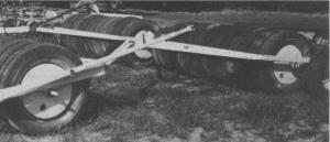 To make the cultipacker, the Zimmer's used 5610-by-20 truck tires - 14 on each wing and 28 in the center section. They simply slid the tires onto a round, water-tight axle - they aren't fastened to the axle or to each other. Randy says the tires aren't filled with concrete or pressurized. If extra weight is needed, the axle is filled with water.