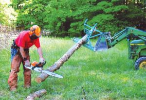 “Basically it’s a manual eccentric arm that holds a de-limbed log in place so it doesn’t tilt or turn, and it sure makes cutting a whole lot easier,” Stevenson says. “I usually grab a log or limb with the forks, lock the Log Dog in place, then drive over to the wood pile and cut away. The last cut is in the middle, between the forks, and both pieces fall on the pile.”