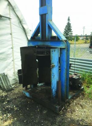 Miles Brett was hired for maintenance and trouble shooting at a Calgary, Alberta, business with a yard filled with thousands of steel 55-gal. drums which used to hold rubberized asphalt crack filler. Brett had to come up with a solution to get rid of them. “I had previously built a log splitter for personal use,” Brett says. “I decided to build a barrel crusher using the same concept, except it’s vertical and larger in scale. It’s equipped with a 5-in. dia. hydraulic cylinder that exerts more than 44,000 lbs. of downward pressure.”