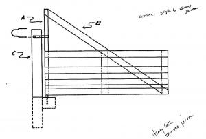 Farm gates made with native lumber are heavy, especially when they stretch to 14 ft. The best strap hinges didn’t hold, nor did a number of other methods. Eventually the farmer, J. Eric Turner, came up with a gate that pivoted on a pipe and was hinged to the top of the gate post.