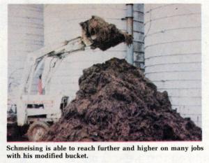 Schmeising, who has tested his unique loader for two years, says it "works great" for a number of chores impossible with a conventional loader: "For example, we can dump manure over a fence so the tractor and spreader don't have to enter the feedlot. This keeps the equipment cleaner and saves you from continually having to open and close gates.