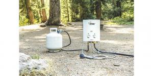 This 5-liter device is manufactured by Camp Chef and measures just over a foot square and makes it possible to heat water straight from a garden hose for a flow rate between 0.5 to 1.5 gals. of hot water per min.