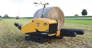 The 6,000-lb. Bale Hawk, powered by a Deutz engine, uses rubber belts to gently scoop, handle and transport three 1,400-lb. bales at a time.