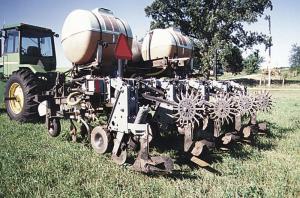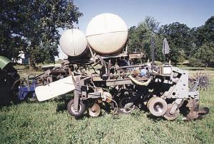 "It's real handy to use because I don't have to mount any pumps or tanks or hook up any hoses or electrical wiring because it's completely self-contained. Both the fertilizer and spray pumps are chain-driven by a hydraulic motor. Another advantage is that I have great visibility ahead of the tractor. I use a Deere 8430 200 hp tractor to pull it. It pulls hard, but the biggest problem is getting enough traction. When the tractor broke down last summer I rented a Deere 4840. It had enough power but not enough traction.