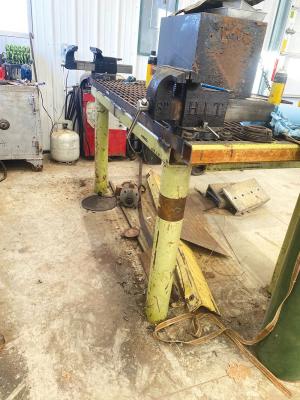 “I used the rockshaft from the weeder and the arms it was attached to make the table,” says Ravenkamp. “The rockshaft was 6-in. dia. steel tubing that I used for the legs with 3 by 5-in. tubing framing the steel grate that I used for the top. I welded nuts into the grate to match bolt holes in the bases of my vises.