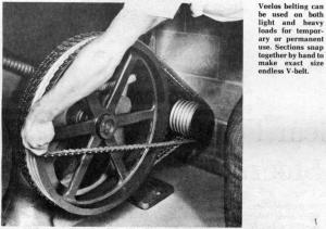 Veelos link V-belting is widely used in industry. It's generally shipped and sold in 100 ft. reels, which is probably more than you'd want to buy and keep on hand for emergency replacement of regular endless V-belts. However, FARM SHOW has located a firm which will make up a sample kit of B size Veelos (21/32 in. wide) and a Veelos plier, which makes it easy to connect individual links. If you'd like to try this 15 ft. long sample, send your check for $37.50 to: Industrial Supply Co., 1100 Third Ave. So., Minneapolis, Minn. 55409.