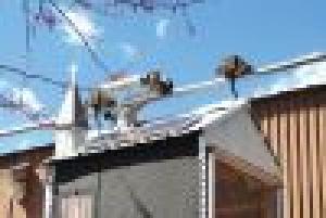Altenweg’s monorail carriage runs on 1 1/2-in. sprinkler pipe with 2-in. pipe standoff supports attached to the side of a metal shed. Between the shed and the house, the rail is supported by arms attached to a ham radio antenna. Cable attached to the antenna above the arms supports them as they link to the monorail line.