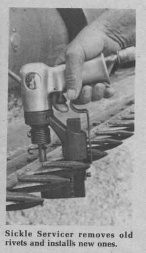 On most machines, you can replace worn or broken sections in less than a minute without having to remove the sickle, says Jerry Cook, designer of a new air-powered tool called the Speed Sickle Servicer.