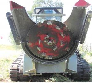 Other attachments are equally unique. They include a tree saw, a stump grinder, and a combination attachment they call the grinder saw. It has a 1/2-in. by 30-in. dia. blade with five replaceable, 4-sided Quadco teeth on its perimeter, four on top and 10 additional teeth on the bottom. As it cuts trees up to 6 in. in diameter, the teeth grind away at the wood. When finished cutting, simply lower the blade over the stump to grind it away.