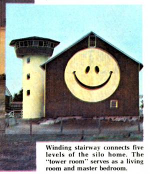 After all, how often has anyone seen an old silo converted into a modern home? And, as though that wasn't enough of an attention-getter, the unique structure is adjacent to a bright red barn adorned with a smiling face that seems to imply everyone else is taking life a little too seriously.