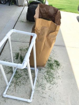 T. Clark from Austin, Texas, recently wrote to FARM SHOW about his homemade PVC yard waste bag frame. He made the frame using 3/4-in. PVC with Ts and 90-degree corners. The bottom of the frame is larger than the top. The top frame is sized to match the yard waste bags. The bags are first folded to form a cuff, which fits over the top of the frame.