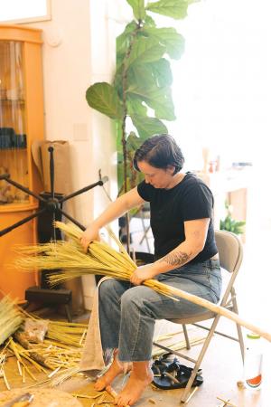 Her material of choice is broomcorn, a type of sorghum with a coarse, fibrous head. It’s been a favorite for broom-making since the late 18th century and was once a significant part of U.S. agriculture. However, cultivation plummeted after the 1960s due to production moving to Mexico, the introduction of plastic brooms, and the widespread adoption of carpet in American homes.