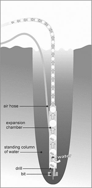The drill is powered by a large air compressor (at least 25 CFM), and as exhaust air passes up the pipe, it creates a vacuum that pulls the water and soil to the surface through 1-in. PVC drill stem. After settling out the solids, the water is recycled. “The most revolutionary idea in the system was using the exhaust air coming out of the tool to pump the tailings from the hole,” says Burson. He reports using the system to drill wells 210 ft. deep, but recommends beginners stick to 100 ft. or less on their first well. In sandy soil, drilling a well can take as little as a day, while clay and rock can stretch drilling out to a week or more.