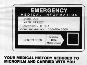 In case of an accident or other emergency, when seconds count, doctors or emergency room personnel only have to grab this card to get your complete medical history. It has been reduced to microfilm and sealed inside a plastic card which travels with you wherever you go to help answer such questions as - Blood type? Diabetic? Heart condition? Allergic to penicillin or other drugs? Eye glass prescription? Family physician and address? Insurance company and policy number? Shot record? Whom to contact for surgical authorization?