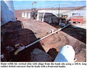 Dunn has two 20 by 80-ft. vertical silos that are located 100 ft. away from the bunker silo. When the vertical silos empty out, he refills them from the bunker silo with a 100-ft. long, 16-in. wide conveyor powered by a 10 hp electric motor.