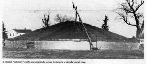 The system consists of an outer ring made of 16 ga. galvanized corrugated sheet metal panels measuring 2 ft. wide and 2 ft. long. Individual sections bolt together to make a continuous ring 6 or 8 ft. high and 40, 80, or 100 ft. in diam A special tarp is then laid over the grain pile and secured to the outer ring by means of a "catenary" cable and grommets.