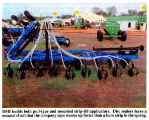 DMI builds both pull-type and mounted strip-till rigs that can be equipped to apply either dry fertilizer or anhydrous in the fall. All units are equipped with markers so you can lay out evenly-spaced rows to plant into the following spring. To apply dry fertilizer, a Concorde air unit is towed behind. Components include a 20-in. coulter, followed by a knife with beavertail sealer on bottom, and double disc sealers (to seal in anhydrous). The double disc sealers leave a mound of soil that warms up early in the spring. Residue mixed into the soil helps prevent erosion.